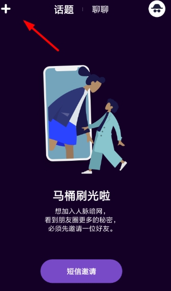 1、如果想要给自己的录音设置变声效果,大家第一步就需要在页面的左上角点击“+”按钮(如下所示),从而进入话题的编辑页面。