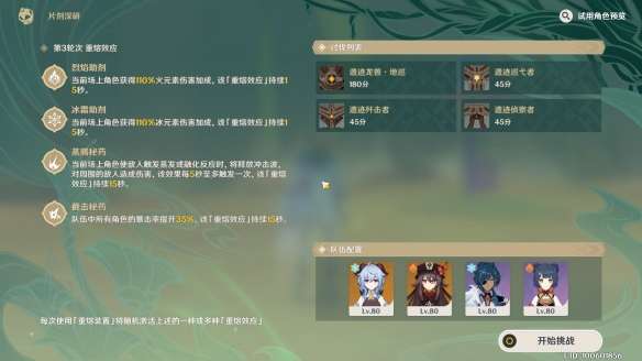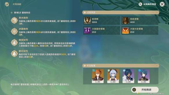 因为选择的难度一,敌人血量不高。挑战时甘雨在地图中心放个元素爆发,然后凯亚行秋元素爆发脱手用公子收割即可,公子元素战技进入冷却后换至甘雨输出即可