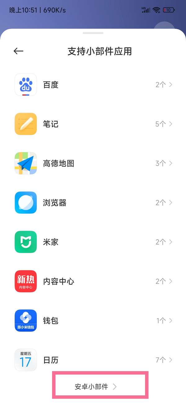 2、点击支持小部件应用旁边的全部,点击安卓小部件。