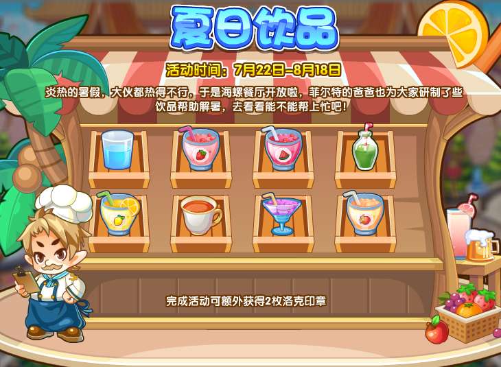 炎热的暑假,大伙都热得不行,于是海螺餐厅开放啦,菲尔特的爸爸也为大家研制些饮品帮助解暑,去看看能不能帮上忙吧!
