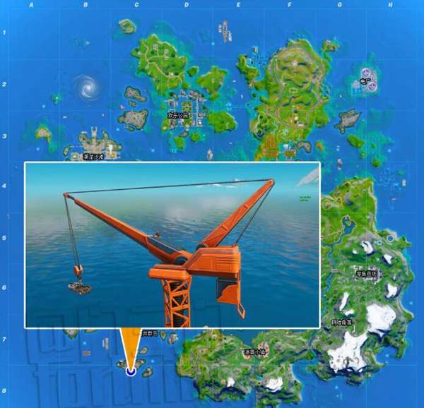 堡垒之夜海上钻井群岛吊塔的位置在靠近C8的点(地图的西南角)。