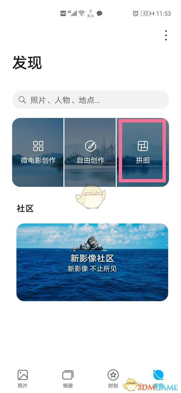 1、首先打开华为手机的图库,切换到“发现”页面,点击【拼图】。