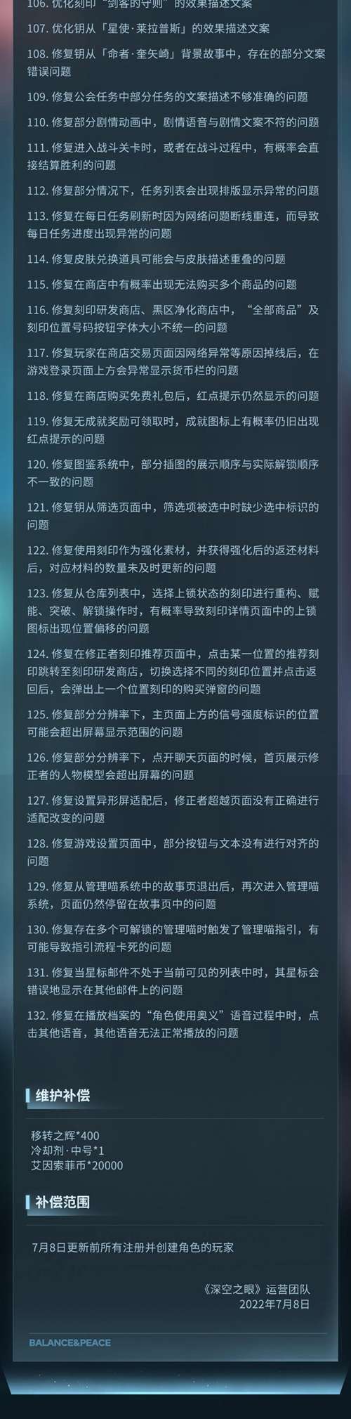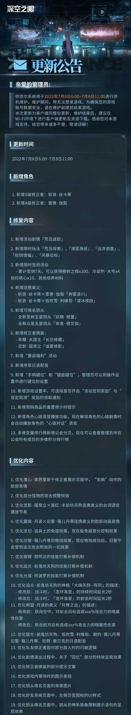 好啦~以上就是深空之眼7月8日停机维护更新公告的所有内容啦~那就让我们明天新活动相见吧~