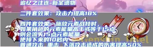 这是在2.0版本上线稻妻之后新出的圣遗物,2件套提供的是基础攻击力加成类似角斗士2件套,4件套效果如图所示,当拥有足够的能量的时候,使用元素战技就能够提供伤害的加成。