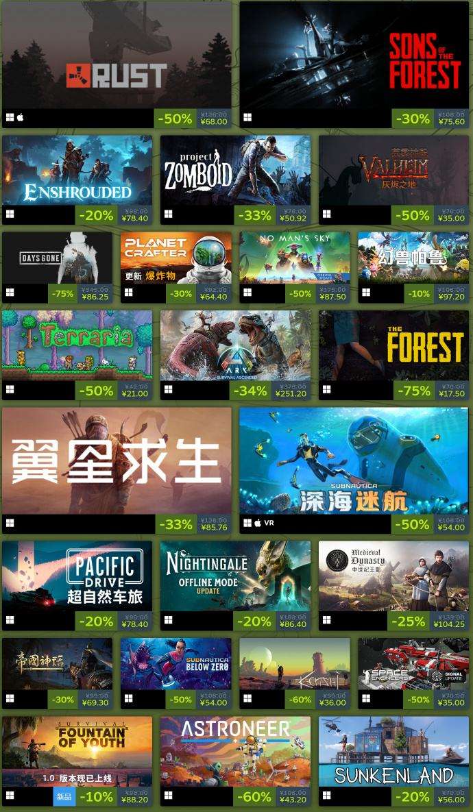 生存类的游戏一直是现在的主流的游戏玩法,因为生存代表着难度和联机,往往与朋友一直努力生存才是最有趣的,而这次的打折活动中几乎都是开放生存的联机游戏,小伙伴们可以来看一看。