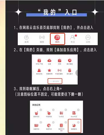 在网易云音乐app中,打开我的,然后添加音乐应用,选择助眠解压添加即可。
