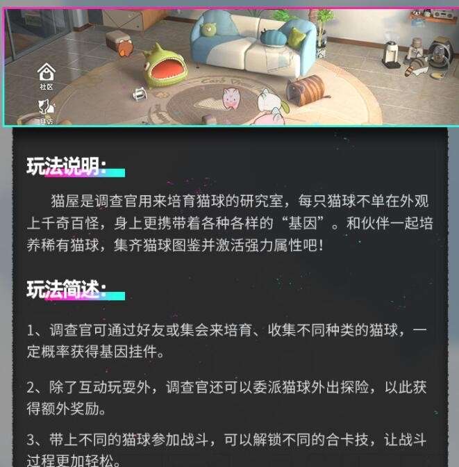 1、调查官可通过好友或集会来培育、收集不同种类的猫球,一定概率获得基因挂件。