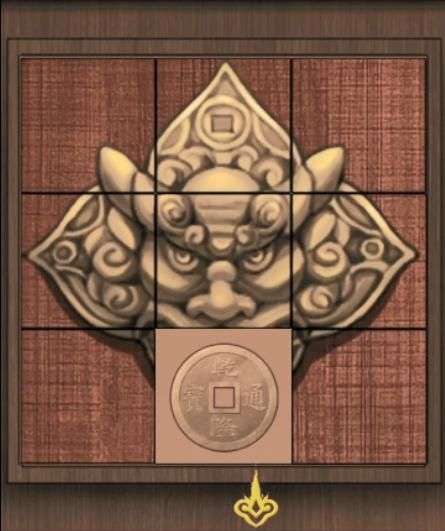 放上拼图调整到下图的样子得到【铜钱】,装到门上左边的口中得到【游戏币】,在左边房间的盒子上装上把手投入游戏币获得【傻开心娃娃】。