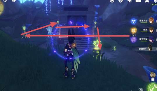 1、召唤出草种子,破坏秘境后面发绿光的石头就可以看到第五块草元素碑。