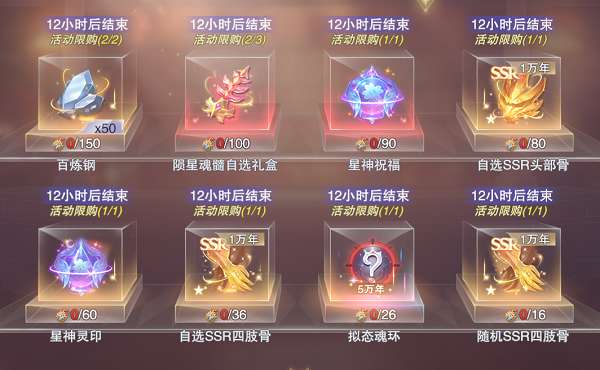 2.最后在抽取之外,我们同时可以获得的星斗币还能在神秘商店中兑换一些资源,这里因为是刚好抽了100次的缘故,毫无疑问是优先兑换了“陨星魂髓自选礼盒”,其中的“陨星魂髓”对于现阶段大部分的玩家来说都是极为稀有的资源,所有其兑换的优先级肯定是这些资源中最高的。
