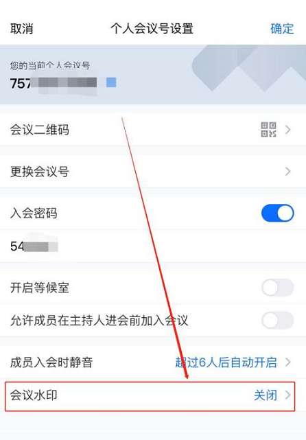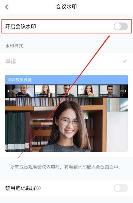 第五步:打开“开启会议水印”后的滑动开关。