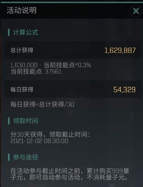 活动规则:玩家累积充值999量子元(无需消耗)即可参与领航员计划,在30天内每日可以获得大量的技能点奖励,帮助玩家们快速提升科技技能等级,解锁和使用更加强大的舰船。