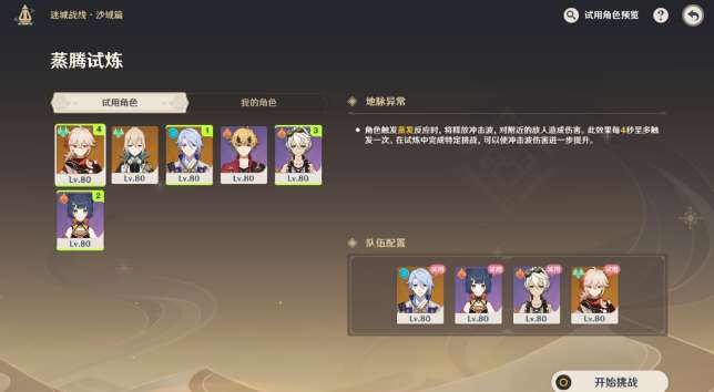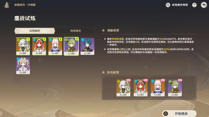 原神3.3迷城战线沙域篇第三天的挑战包括两个试练,分别是鏖战试炼和蒸腾试炼,以下是详细的过关流程: