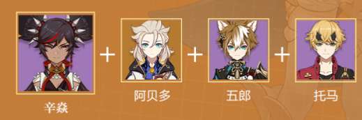 阿贝多提供后台伤害输出,五郎提供优质的防御力提升,满命托马提供重击伤害加成,配合辛焱组成双火。将伤害更上一个台阶。