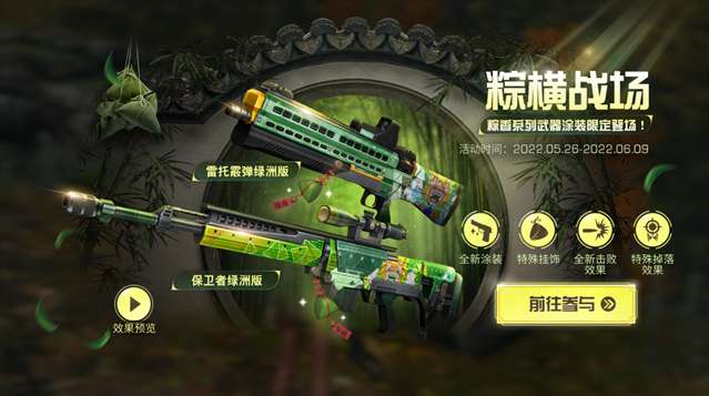 5月26日-6月9日期间,联盟推出了全新粽香系列武器涂装,绿洲版保卫者等酷炫武器涂装限定登场,更有全新粽子系列无人机旷野青鸢、战虎·碧焰、风暴青狮限时获取,快来提升你的战斗实力吧!