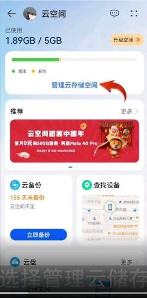 2、在账号中心之中点击云空间选项然后选择管理云储存空间。
