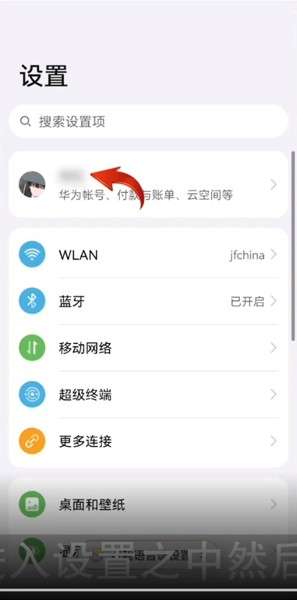 1、打开华为手机进入设置之中然后点击个人头像进入。