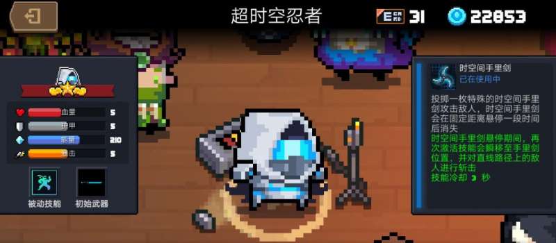 将忍者和工程师升到满星之后,我们便可以解锁另一个英雄角色超时空忍者。作为来自未来的忍者,超时空忍者的战斗画面十分帅气,她每一次靠近敌人进行输出,都会自动释放自己的被动技能,从而对四周的敌人进行打击,而且清除弹幕。主动技能时空手里剑可以投掷出去,如果再次点击这个技能,还能触发第二段效果,直接瞬移到手里剑的位置,并为周围的敌人施加麻痹。由于被动技能的冷却与主动技能的冷却,二者相互配合,可以打出不错的组合效果,实战起来极其飘逸。