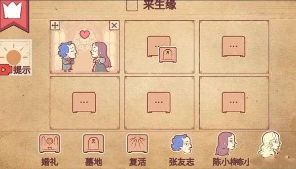 4、这时玩家就将婚礼放入第四个框,再将张友志陈小梅放入进去他们虽然变成了鬼魂,但是他们又相爱了然后就通关啦,如图所示。