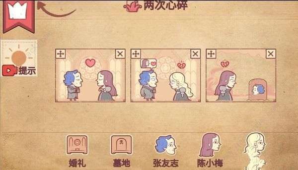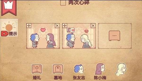 3、玩家将墓地放入第三个框,再将张友志放在墓碑里,然后将陈小梅放在第三个框,陈小梅看到张友志死了心就碎了,如图所示。