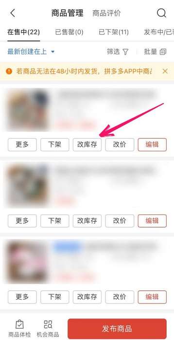 第二步:在拼多多商家商品管理的页面里点击改库存。