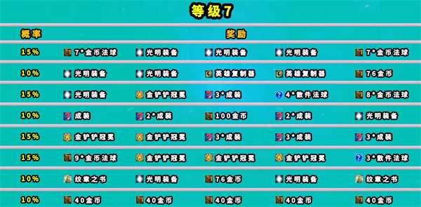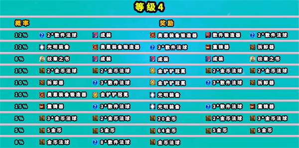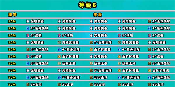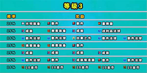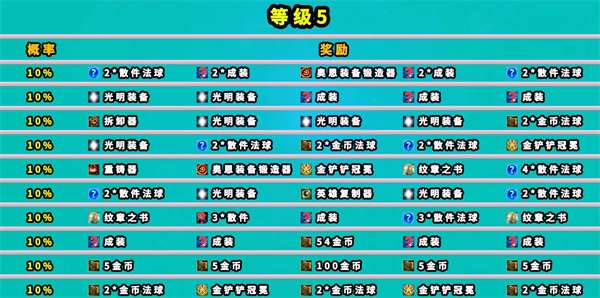 6、玩家在第五层依旧由概率获得散件,光明装备,拆卸器,重铸器,金铲铲冠冕,纹章书,金币等奖励。