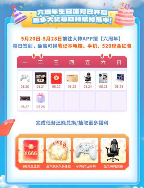 寻找六周年幸运儿,送上祝福成为派对C位。前往大神APP@大神 转发大神六周年生日动态,送上你的生日祝福,即有机会瓜分666现金红包,抽傲风M6电竞椅、小鸡G7 se手柄!