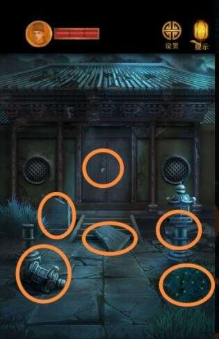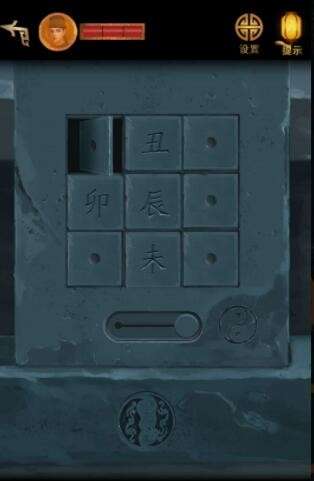 后面的石壁底下凹槽放入两瓣石佩,点击中间的钮,上面的石板一块块掀开,记下顺序。结合刚才另一段石壁上的线索,得到开门暗号。