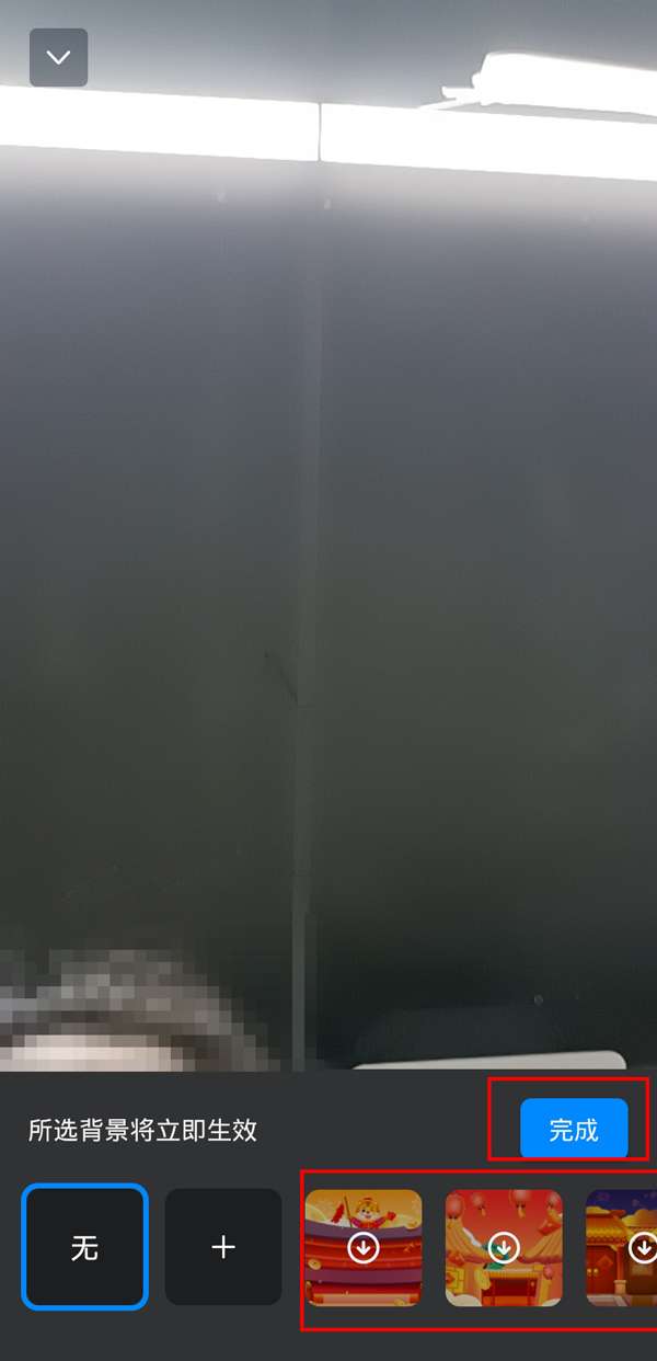 2、然后选择自己喜欢的虚拟背景后点击【完成】即可。