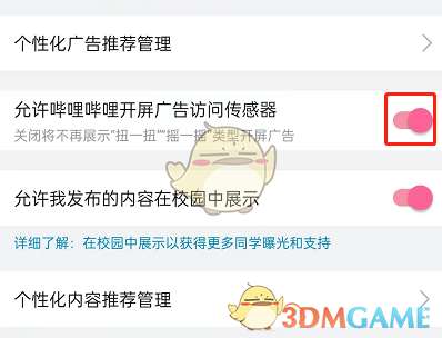 3、将允许哔哩哔哩开屏广告访问传感器右侧开关关闭即可。