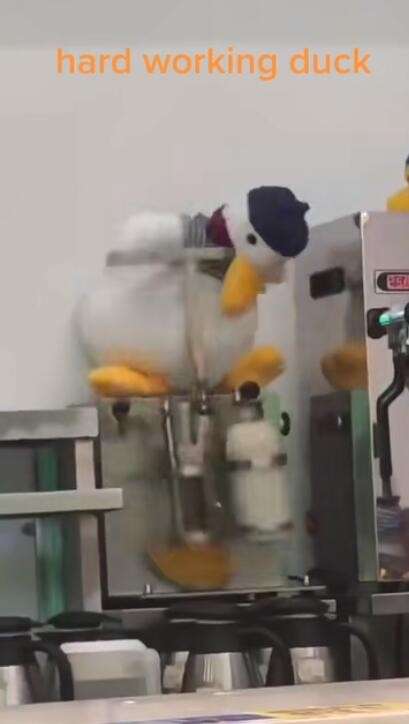 指奶茶店的在努力工作摇奶奶茶的鸭子玩偶,也指谐音“要奶茶呀”
