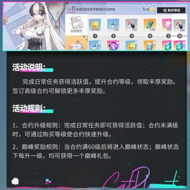 完成日常任务获得活跃值,提升合约等级,领取丰厚奖励。