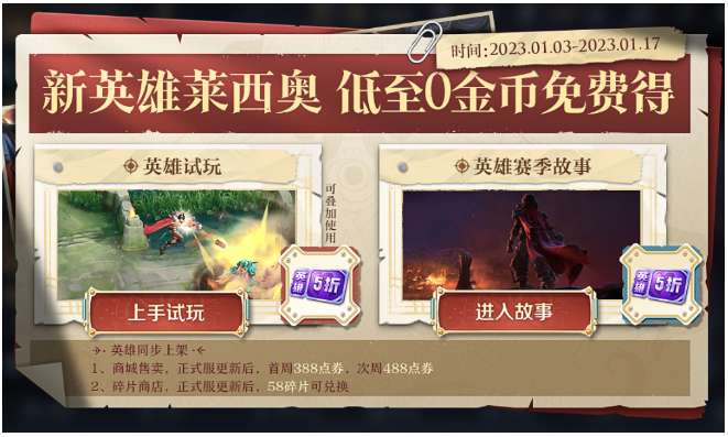 通过英雄试玩和英雄赛季故事系统,得2张英雄金币五折卡,叠加使用后0金币免费得英雄(一张五折卡可抵扣莱西奥半价购买金币)