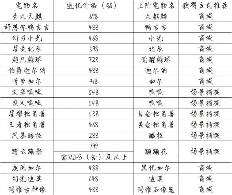 进化版以及需要准备的上阶满级宠如下所示——