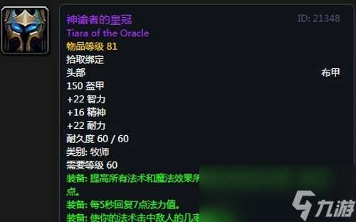 神谕者的皇冠:头部,150护甲,+22智力,+22耐力,+16精神,出自安其拉副本任务获取,推荐附魔专注秘药。