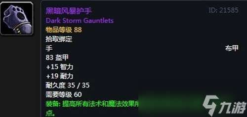 基础属性:95护甲,+21耐力,装备效果使暗影法术所造成的伤害提高最多64点。