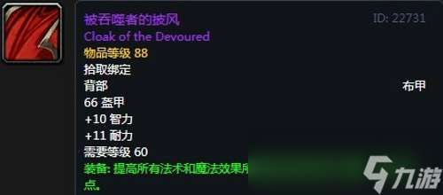 被吞噬者的披风:紫色披风,66护甲,+10智力,+11耐力,出自安其拉克苏恩掉落,推荐附魔狡诈;