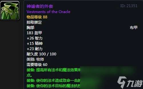 基础属性:101护甲,+21智力,+16耐力,+21精神,+10奥术抗性,+10暗影抗性,装备效果提高法术所造成的治疗效果,最多46点,每5秒回复7点法力值。