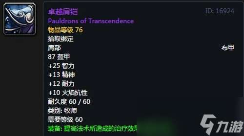 基础属性:51护甲,+13智力,+9耐力,+16精神,装备效果提高法术所造成的治疗效果,最多33点。