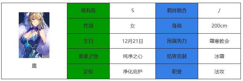 风雪为衣的露,在旅途中感悟世间真实之路。提高15%生命和10%防御,普攻后为己方血量百分比最少的2个单位恢复攻击100%的血量。