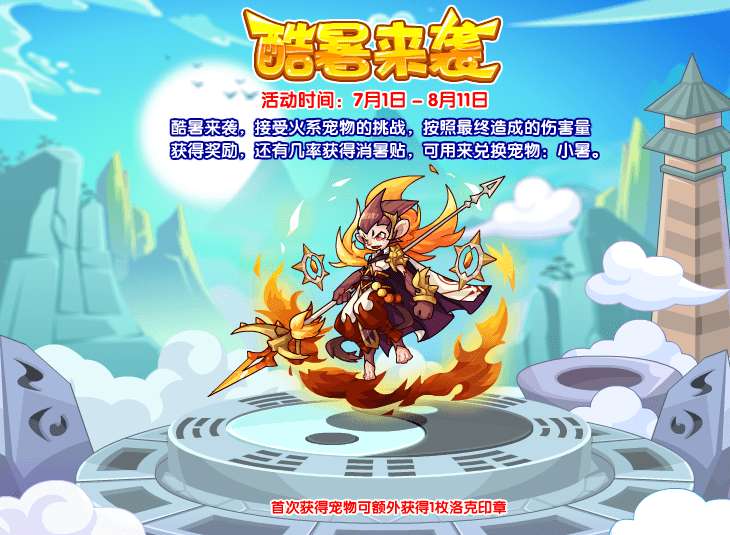 7月1日-8月11日参见酷暑来袭活动,接受火系宠物的挑战,按照最终造成的伤害量获得奖励,还有几率获得消暑贴,可用来兑换宠物:小暑。