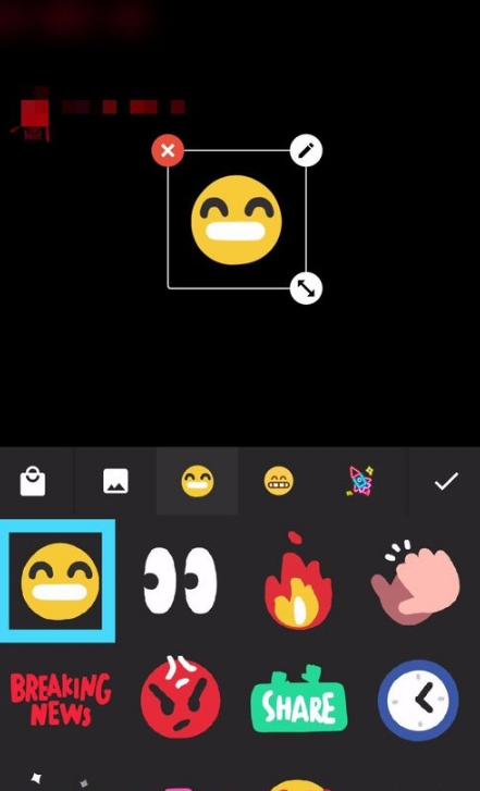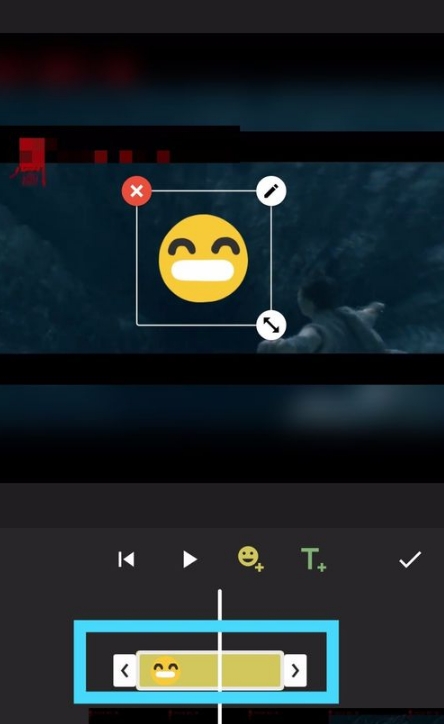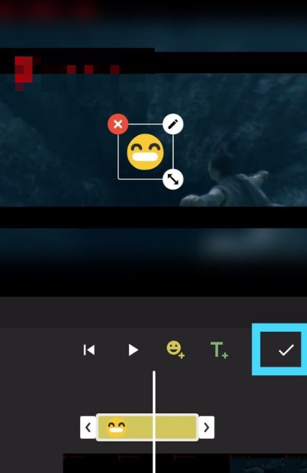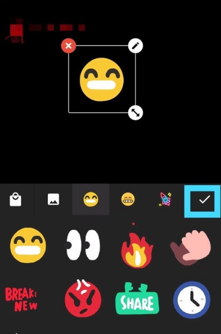 使用贴纸后,在视频中可以设置贴纸的位置和大小,然后点击右边对号选项。如图所示
