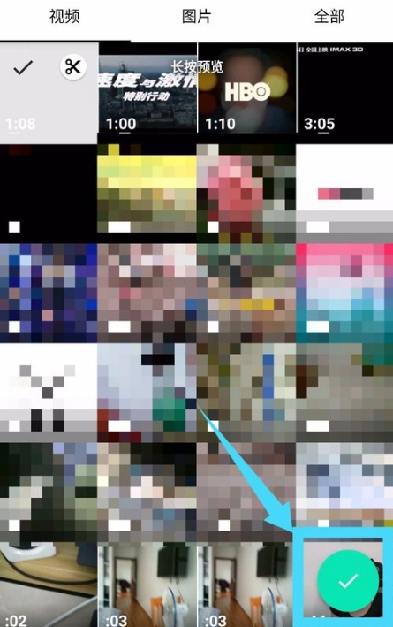 选择要添加贴纸的视频,然后点击右下角的对号。如图所示
