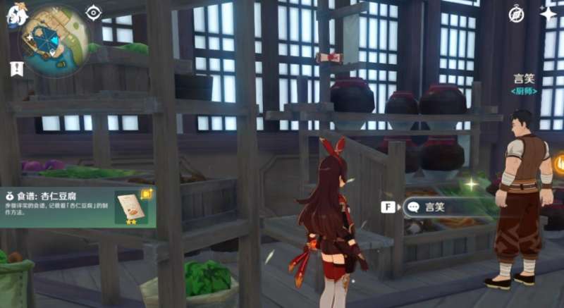 自己制作的话就需要先获取配方,地点同样在望舒客栈中,玩家通过地图里的传送锚点进入。在厨房里玩家需要找到一名叫做言笑的npc,与其对话以后,他会问我们想要干什么,玩家需要回复他想要知道杏仁豆腐如何制作的。接着他就会赠送给我们一个配方,玩家打开背包直接学习即可。