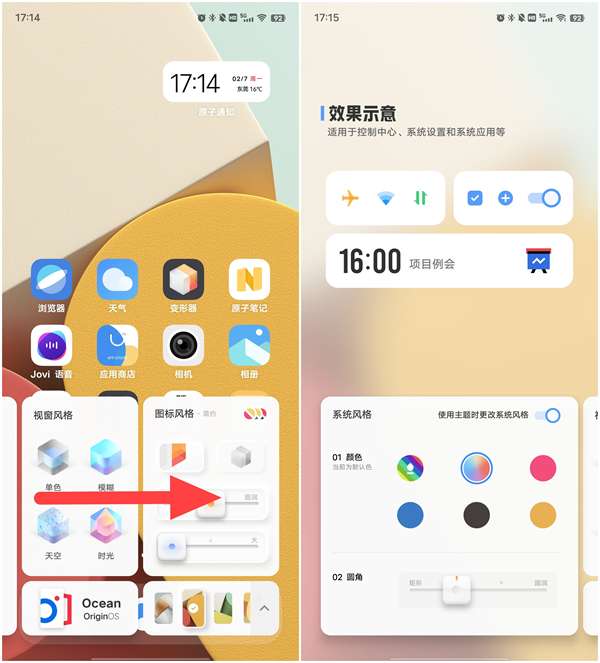 3、开启“使用主题时更改系统风格”后会跟随当前主题的颜色或圆角,关闭则不跟随。
