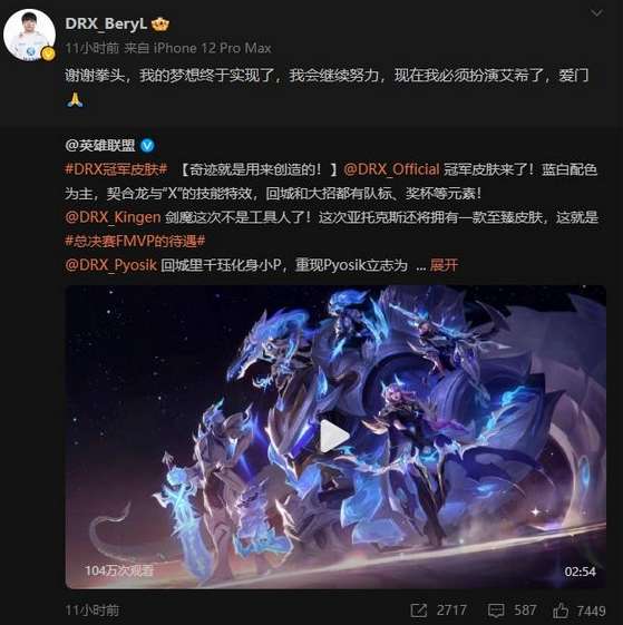 另外,被玩家称为“原神哥”的BeryL这次也终于圆梦了,在夺冠后他曾表示希望自己的冠军皮肤能以《崩坏3》角色爱莉希雅为原型制作,这次皮肤公布后,BeryL也转发的该微博,并表示:“谢谢拳头,我的梦想终于实现了,我会继续努力,现在我必须扮演艾希了,爱门”。