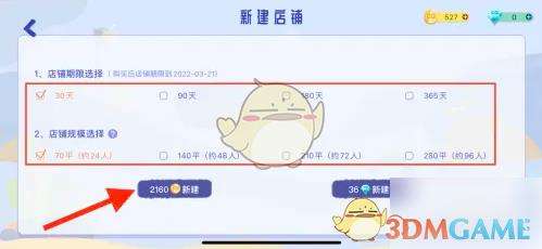 4、最后,按照喜好选择店铺时间期限和店铺规模,点击下方新建按钮即可完成开店。