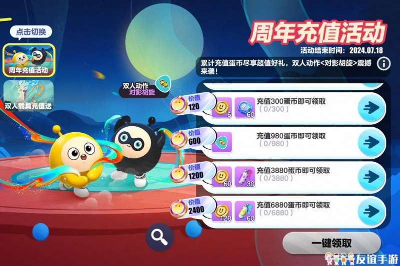 6月7日(周五)至6月13日23:59,蛋仔们累计充值达一定数量的蛋币,即可获得双人动作<对影胡旋>及最高达192枚许愿币等好礼!