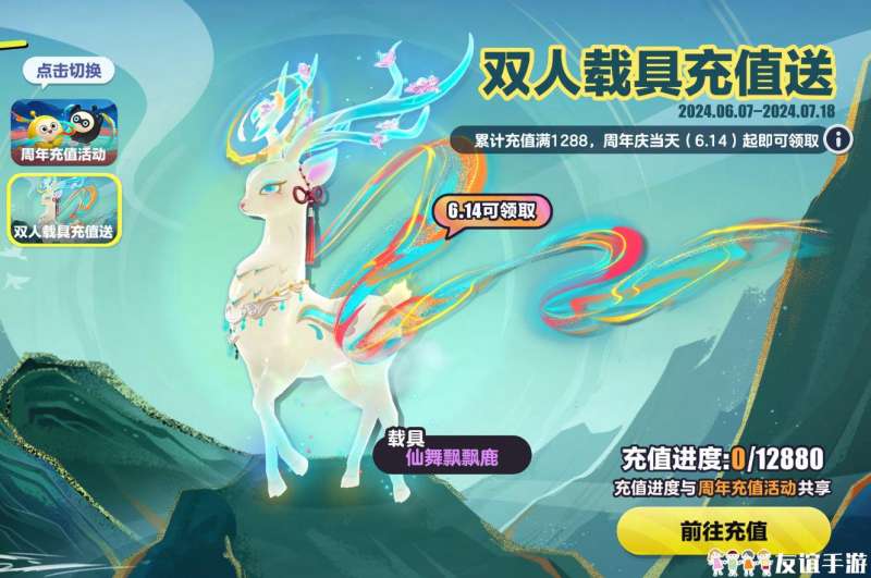 6月14日(周五)2周年庆当天,达到指定充值档位(第一阶段内的充值可累计)的蛋仔们即可解锁全新双人载具<仙舞飘飘鹿>。鹿蹄轻点大地,色彩交织流动,脉脉清辉洒落,如越千年光影向你奔来。