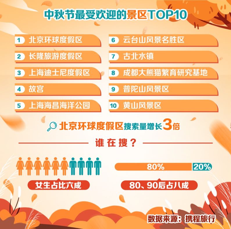 携程数据显示,截至9月6日,中秋节最热门的旅行目的地前十名有:北京、上海、广州、杭州、成都、三亚、深圳、重庆、珠海、武汉。9月20日正式开园的北京环球度假区助推北京旅游热度,携程平台近期目的地访问热度北京连续多日稳坐第一,搜索热度遥遥领先于其他城市。数据显示,9月6日通过携程预订北京中秋度假产品的人次较8月20日增长近8倍。中秋节北京升温还体现在机票、酒店价格的提升。截至9月6日,中秋节期间北京进出港单程人均客单价为877元,同比去年增长约两成。